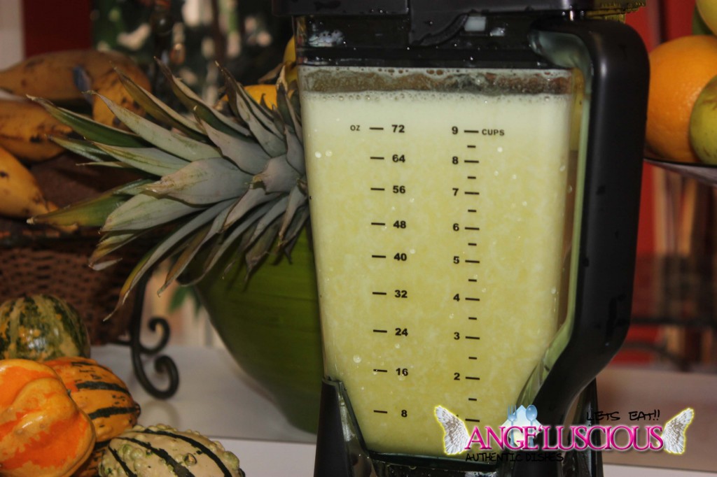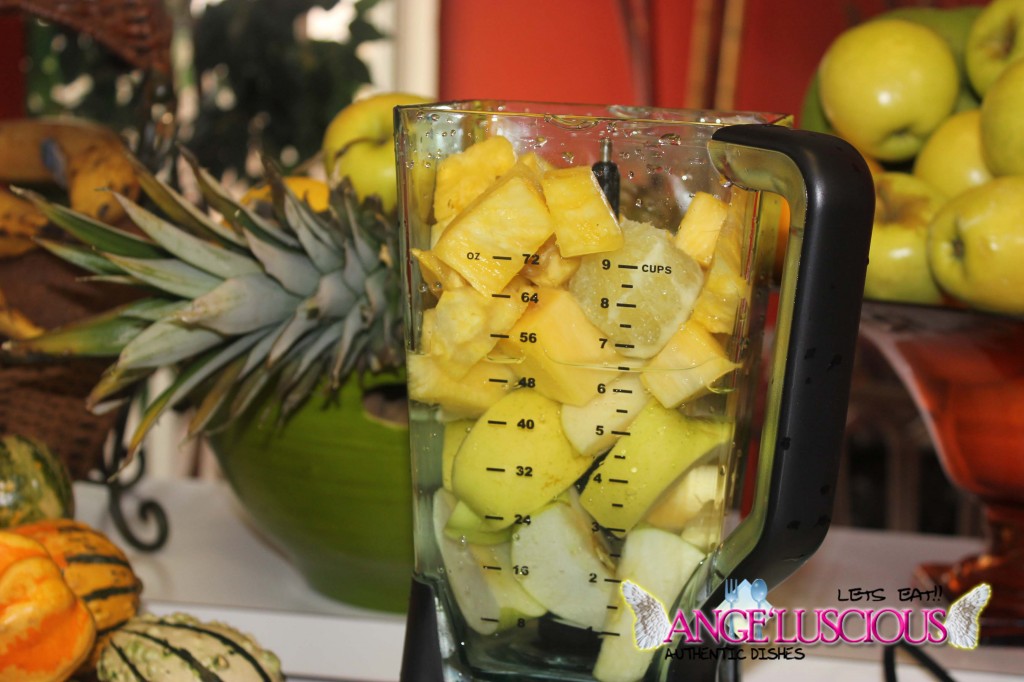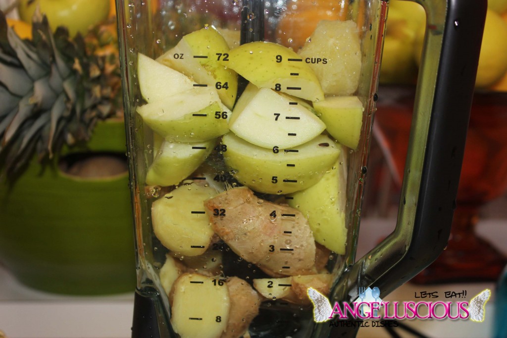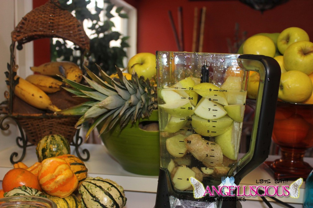 Tis the season to eat lots of apple pies! The apples are now posted out front, in visible sight everywhere! If my memory serves me correct; I picked up a 7 pound bag of ginger crisp apples….yeah….I think it was 7 pounds… and knew I would be using them wisely. I love ginger “anything!” I decided to make a drink since I didn’t have any apple cider. I LOVE apple cider! I have never really used apples in my smoothies or juices. I usually just eat them as is or transform them into compotes for pancakes and cakes and stuff. Since I almost always have pineapples on hand, I decided to blend them together. In total, I added a 2 lemons. It tasted really refreshing and it guess what? It didn’t need a sweetener. This one could definitely ride solo. It was amazingly d’luscious all on its own.