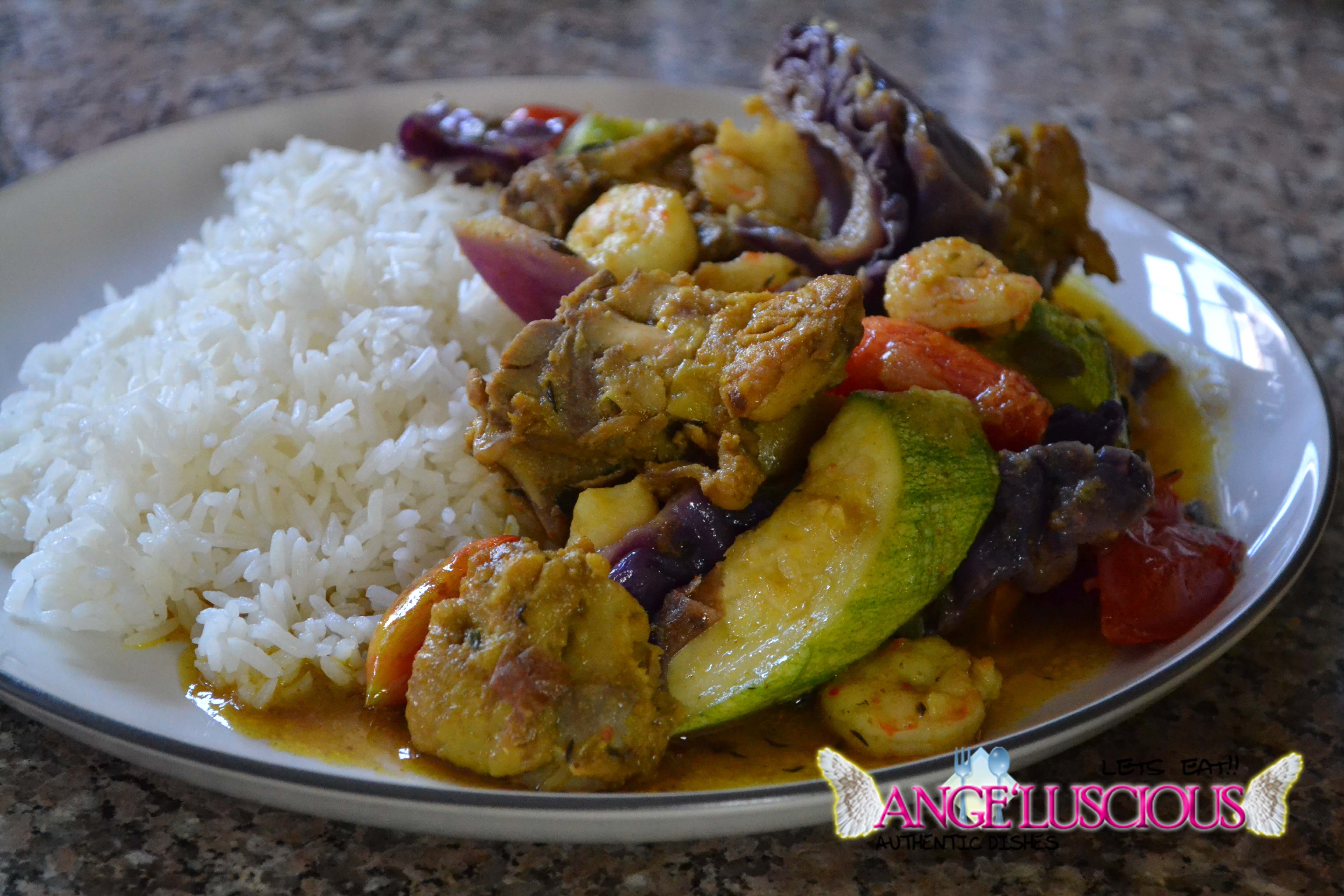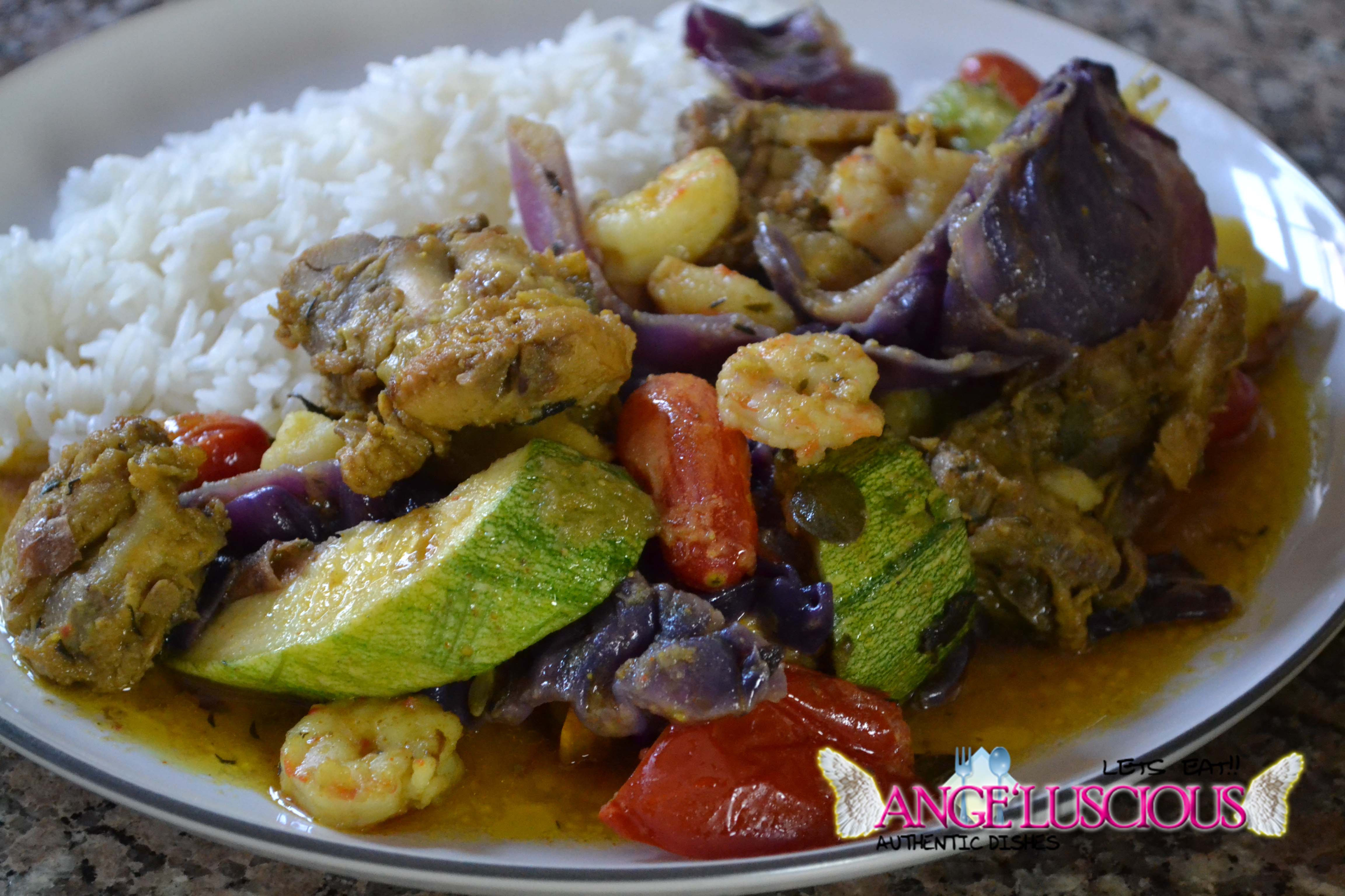 Curry Chicken Back with purple cabbage, heirloom tomatoes and zucchini